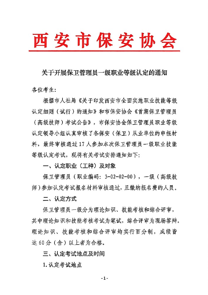 关于开展保卫管理员一级职业等级认定的通知